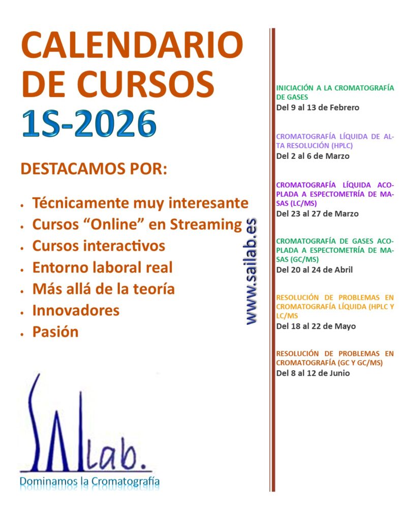 | Curso "On-line" de Iniciación a la Cromatografía de Gases (GC) | 26-1S-GC | Del 9 al 13 de Febrero 2026 | Descargar |